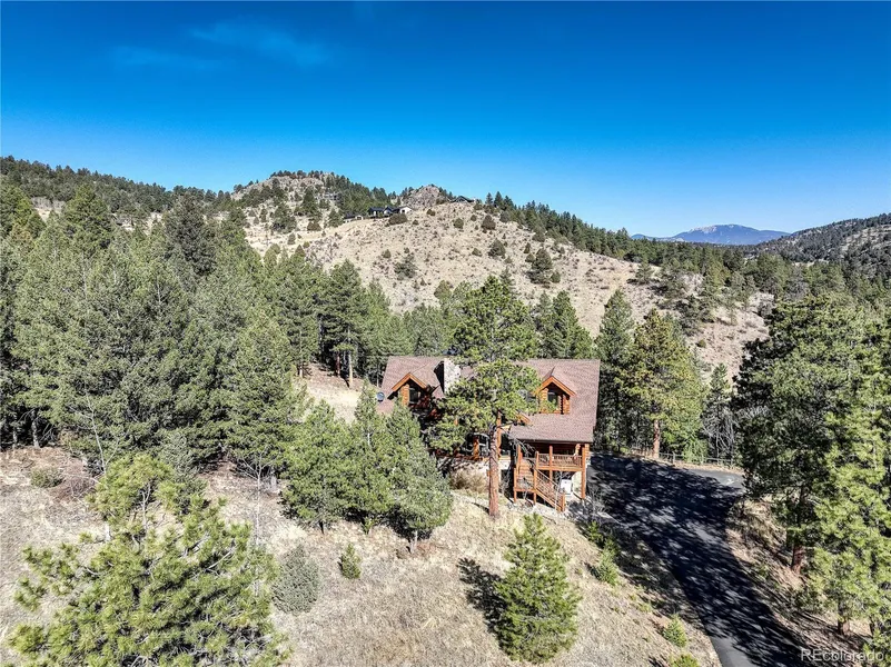 This spectacular custom log home boasts everything you would dream of for your Colorado Mountain home. Situated on over 5 secluded acres and surrounded by approx. 600 acres of open space with mountain views and beautiful rock outcroppings. Upon entering this home you will be embraced by the open floor plan, rustic hardwood floors, and log accents throughout. The family room has an expansive gas fireplace and walls of windows flooding this home with natural sunlight. The gourmet, chef's kitchen was recently updated with custom cabinetry and offers high-end Stainless appliances including a 48" gas cooktop, 2 dishwashers, 2 sinks, double oven, wine and beverage refrigerator, dumb-waiter, granite countertops, and spacious walk-in pantry. Adjacent is a grand dining room that leads to a deck offering a built-in gas grill and service center. The main floor master provides separate deck access, gas fireplace, dual sinks, jetted tub, large shower, and walk-in closet. Additionally, a main floor laundry room with a utility sink, and 1/2 bath. The upper-level loft is ideal for a den or perfect office space. The 2 additional spacious en-suite bedrooms both boast full baths and walk-in closets. The lower level provides a recreation room with a gas fireplace, a 4th non-conforming bedroom, also with a gas fireplace, and a bonus room- perfect for media, or exercise room. Walk out onto the private lower deck to enjoy the peaceful evenings with breathtaking vistas with an all-new hot tub and composite deck patio with gas hookup for a fire pit and handsome pergola. You will love the peace of mind during the snowy winter months having a Generac whole-house gas-powered backup generator. This home's ideal location is only 2 miles to HWY 285, 40 minutes to Downtown Denver and 1 hour to world-class skiing. Move-in and start enjoying all that the mountain lifestyle has to offer!