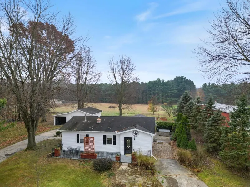 Escape to your own slice of country heaven with this well maintained 3-acre property, offering the perfect balance of peaceful rural living and the convenience of nearby town amenities. Located just minutes from the scenic Bonneyville Mill County Park, this property is a nature lover's dream. As you step inside the home, you are greeted by a cozy living space featuring a charming wood-burning fireplace. The living room flows seamlessly into the kitchen, which boasts ample storage, including a walk-in pantry. The spacious dining area features charming built-in corner hutches and even more storage with a large closet. The primary bedroom is generously sized, complete with two closets and access to a secluded patio. This property also offers exceptional potential with two versatile outbuildings. The smaller garage is currently set up as a woodshop, complete with a lean-to for added storage and convenience. The larger garage features a concrete floor, a wood burner, and additional space for all your hobbies or equipment. Above the garage, you'll find a fully finished room that can be used as extra storage, a home office, or even a cozy hangout space. The outdoor space truly shines with a fenced pasture, multiple entertaining spaces, and mature trees. The natural beauty surrounding the property adds to its charm, making it a peaceful retreat for anyone looking to enjoy the best of country living.