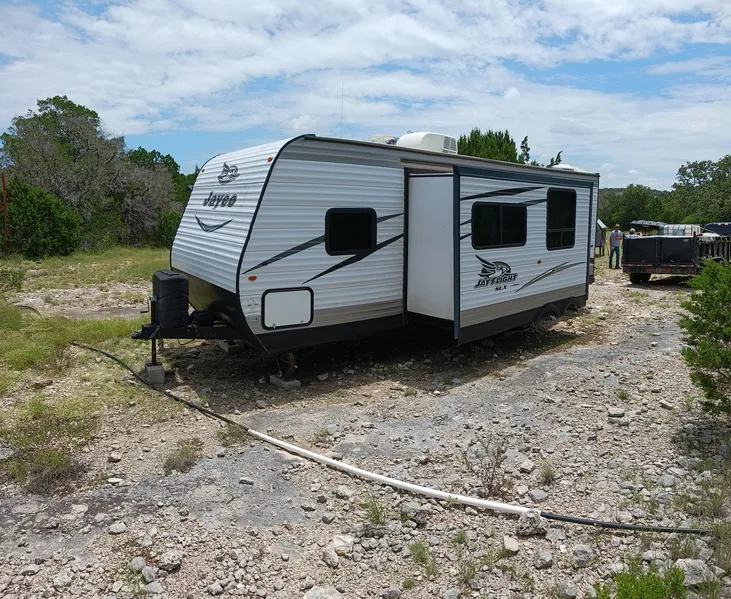 Camp site includes 2017 31' Jayco Jay Flight SLX travel trailer, 20' conex box, vault cooler, and camp generator.