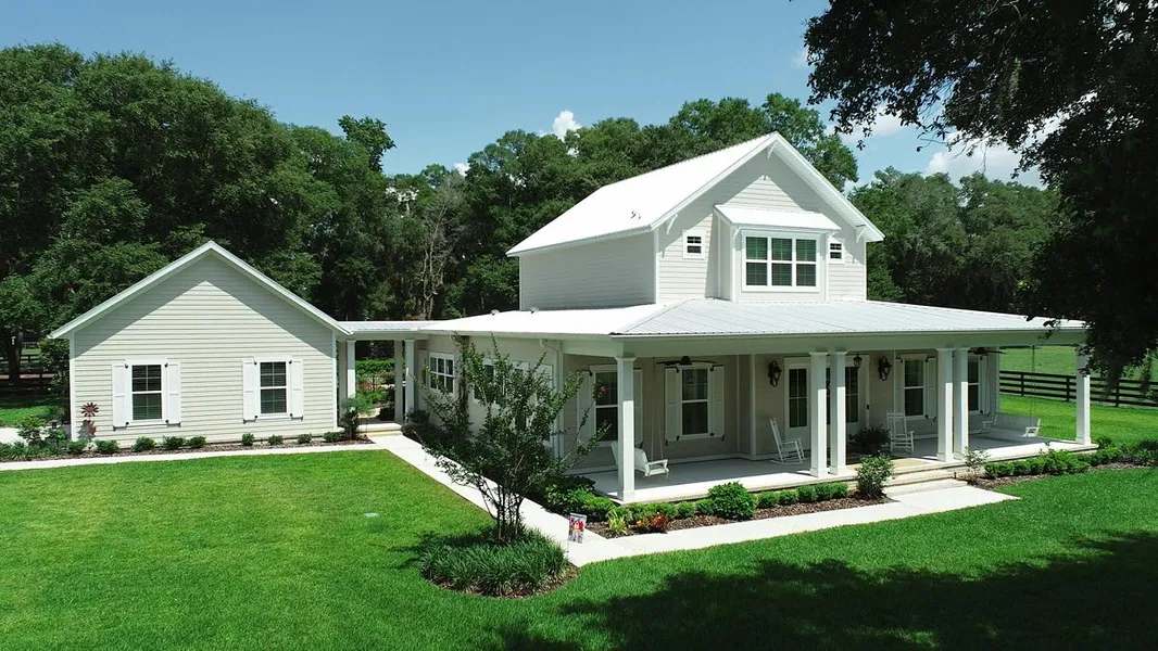 Exquisite gated modern farmhouse, located on 10+/- acres. The impressive front porch provides views of the live oaks and mature landscaping. Inside this beautiful 2 story home is 3 bedrooms, 3.5 baths plus office/or sitting room with 3,143 SF of living area. The open floor plan creates a seamless flow between the living room, kitchen, and dining area, making it perfect for entertaining. Enjoy the chefs kitchen with ample counter space, custom wood cabinetry, stone counter tops, Viking appliances, separate beverage fridge, 6 burner gas range, an island with extra seating and spacious dining area. The family room offers a grand center fireplace, coffered ceilings, and built-ins. Owner's suit on the main level. Upstairs features 2 en-suite bedrooms. Other features include 12 wood plank floors, designer selected lights, crown molding and stately craftsmanship throughout, 2 zoned A/C units and a 50 gallon propane tank. The pool, spa, firepit and outdoor living space matches perfectly with the pristine interior and allows for entertainment or private enjoyment. Location is incredibly convenient. Between Ocala and The Villages and with close proximity to the Florida Horse Park or the Marjorie Harris Carr Cross Florida Greenways & Trails.