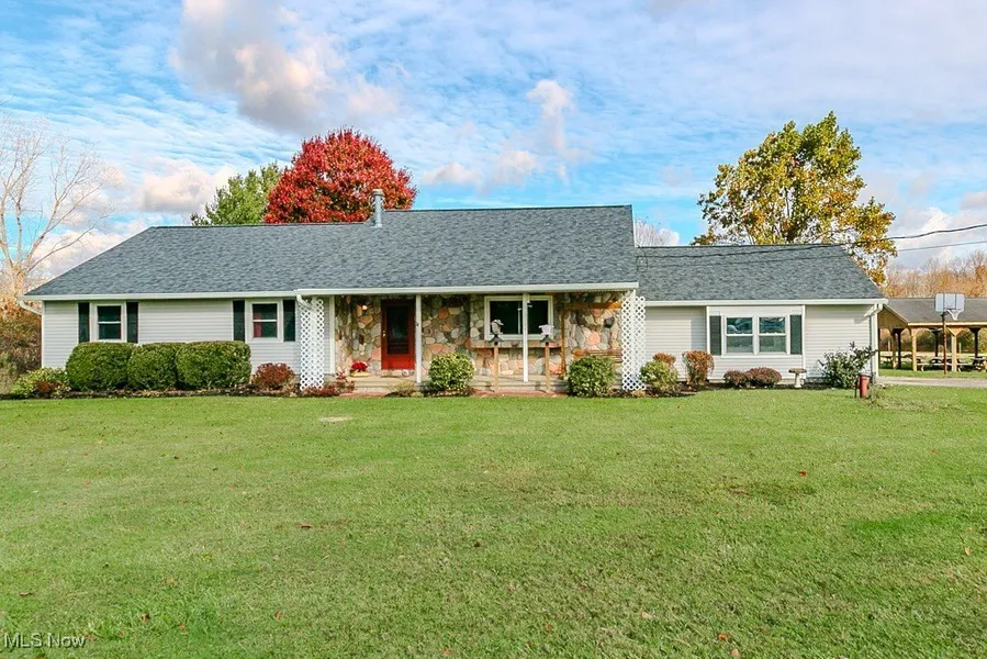 Chardon Ranch offering both acreage & updates! Professionally cleaned & move-in ready! Well-maintained 3-bed, 3-full bath home with great indoor and outdoor amenities. Inside, fall in love with the spacious kitchen that sits at the heart of the home! Abundant and beautiful cabinetry provides space for all your kitchen needs. The large island offers additional storage and electric. Generous eat-in area transitions nicely into the family room overlooking 5.4 acres of foliage and nature's splendor! Perfect for gathering and making memories! Main-level living includes a generous master bedroom w/ three closets and a remodeled master bath (2020). Newer carpeting in bedrooms (2023). First-floor laundry w/newer washer (2023) & dryer (2020). Mudroom w/additional storage, shelving, & stand-up freezer accessible from side porch. Over 1100 sq ft in the unfinished basement provides great recreation space for pool, darts, tinkering at the workbench, and built-in shelving to stay organized. Mechanical updates include furnace (2020), central air (2020), newer electric panel (2019), ozone iron removal system (2023), and interior footer drainage (2023). Attached 2-car garage w/storage shelves, workbench, and attic storage access. Outside, sit on the front porch swing and watch the birds at the feeders. Gather with family and friends under the outdoor pavilion and sit by the fire; hookup the tv to watch the game fireside or under the pavilion. Grow your own food in the garden bed. Practice your golf game in your own backyard! Exterior updates include newer roof (tear-off 2019) w/larger gutters and downspout drainage (2023). Storage shed houses a newer riding mower that is negotiable with the sale. Bonus: no city income tax in Hambden Twp. Chardon LSD. Appointment only; must be accompanied by a licensed real estate agent to walk property & tour. Not all homes are set up for spacious main-level living & outdoor fun like this! Call your favorite agent to schedule your showing today!