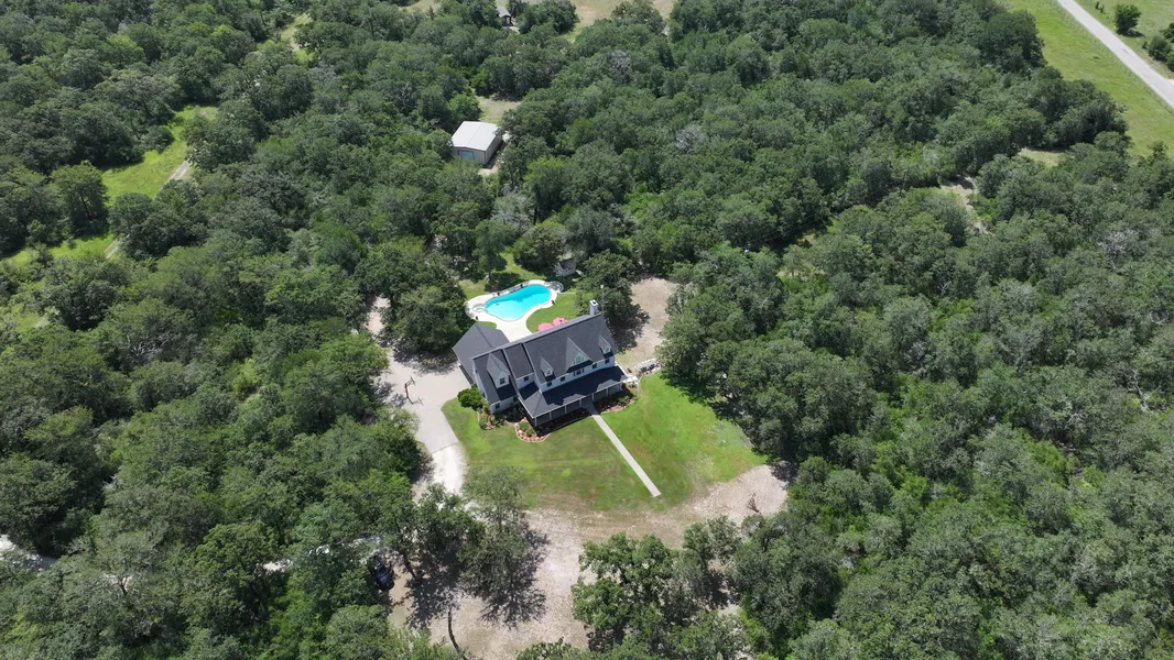 Custom, original owner home that is nestled amongst beautiful hardwoods, down a long, secluded driveway just outside of Snook, TX! This 3,796 sqft home sits on 25 acres, boasting 4 bedrooms and 3 1/2 bathrooms. Enjoy the functionality this home has to offer with an airy and bright kitchen with a Jenn Air cook top, double ovens, beverage fridge, walk-in pantry, & built-in desk! Separate breakfast area and formal dining room. Create memories in the spacious family room with built-in shelving & fireplace overlooking the backyard pool! An en-suite is located on the 1st floor with a shower/tub combo, along with a half bath situated off of the foyer. A grand staircase leads to the 2nd story, that features a generous sized primary suite with a shower and separate garden tub, 2 vanities, make-up counter, and walk-in closet. Two additional guest bedrooms are situated on this floor with a full bath, and bonus/game room that could easily be used as an additional oversized bedroom. A built-in desk area is located on 2nd story, as well. Relax and unwind with the beautiful front and back porches, and take in the summer sun in the pool and hot tub. A 30x40 shop sits towards the back of the property with electricity and concrete slab, along with a 28x10 tiny house. Additional features include partial & perimeter fencing, mature hardwoods & paved county road frontage. Wildlife exemption currently in place. Snook ISD. Flooring updated Jan 2024!