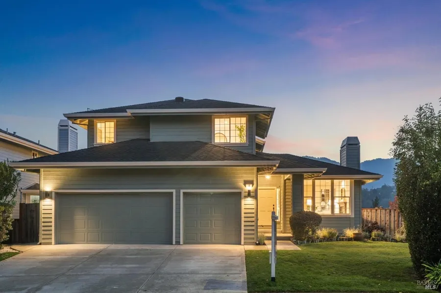 Fresh finishes, sunlit interiors, and an inviting sense of home greet you at every turn. Newly refinished wood flooring, contemporary lighting, and a crisp interior paint palette establish a refined, cohesive aesthetic throughout. Natural light fills the home from morning to evening, with expansive windows artfully framing the sweeping hillside vistas. Multiple living areas feature beautifully updated fireplaces that add warmth and architectural presence, flowing seamlessly into the refreshed kitchen with quartz counters, painted cabinetry, and all new stainless steel appliances. Upstairs, the generous primary suite is complemented by three additional bedrooms and a central hall bath, while a main-level bedroom or office with an adjacent full bath offers welcome versatility. The newly epoxied 3-car garage offers ample storage and potential for a home gym or flex space. Outdoor areas are designed for effortless living, with spaces to gather, dine, and unwind year-round beneath the covered pergola. The garden provides seasonal beauty with cherry, fig, apple, pomegranate and lemon trees, roses, and grapevines creating an ever-changing, vibrant backdrop. Owned solar supports sustainable, cost-efficient living, while the corner-lot setting enhances both privacy and openness. Set within a highly sought-after neighborhood celebrated for its genuine sense of community, the home is moments from Hillside Park, Marin Country Club, Nugget Market, Pacheco Plaza, bike paths, and nearby hiking trails - bringing convenience, recreation, and nature to your doorstep. Rich in warmth, style, and a true sense of belonging, this home is ready to embrace its next chapter.