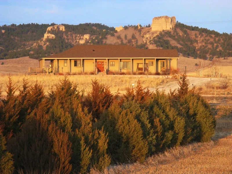 Click here to watch a 3-D tour of this property. Enjoy breathtaking views from the living room of this estate in the heart of Nebraska’s famed Pine Ridge! This exceptional property comprises 15 acres and a gorgeous 5,000 sq ft home with astonishing views of Lovers Leap and Crow buttes that mark the entrance to Fort Robinson State Park. Use the 360-degree tour to explore every inch of this warm and inviting home. The home is of a classic Craftsman design with a dramatic 360 wrap-around covered porch and deck. There is always a side in the shade or out of the wind to sit and enjoy the peace and beauty of the area. There are five bedrooms and three and a half baths with laundry and the master suite on the main floor. Hardwood cherry flooring, trim, and solid doors throughout are proof of the quality and expense taken in construction of this home. The kitchen was thoughtfully designed to meet any chef’s standards with white-washed cupboards and a large center island. The space flows seamlessly into the living and dining area with easy access to an enlarged side of thewraparound deck for outdoor dining. The show-stopping feature of this home is the living room with its large picture window with the Lover’s Leap Butte centered within it. Standing there and enjoying that magnificent view, one comes to realize that the home was precisely sited so that its prime view would be centered squarely on this fantastic landmark. The main floor is rounded out with a generous laundry room, an office, a guest bedroom with adjoining bath, and the master suite. The master suite includes the bedroom, a large his and hers walk in closet, and a spacious bathroom complete with a bidet. Adjoining the bedroom is a bonus roomthat the previous owner’s used as an art studio, but that could serve any hobby or interest, or simply be used as a quiet retreat. After the enclosed entry and at the top of the stairs is a large closet that was designed to accommodate an elevator to the lower levelshould any future owners wish to install one. The lower level offers an entry hallway and closet to walkout to a patio and a lush backyard. There is also access to the patio through a small mudroom with access to the garage. Outside a great deal of good black soil was brought in when the home was built, and underground sprinklers installed so that the many trees, perennial beds and lush lawn could flourish in this normally dry, rocky landscape. Gorgeous built-in cherry bookshelves line the wall of the lower level’s main room and frame a space for up to a 70inch TV. You might call this space the library if not for the fully appointed wet bar that suggests the space is used for farmore than just studious reading or watching movies and sports. Just off this room is an enormous storagepantry with shelving and freezer space large enough to provision a whole family through a long winter! There is even an ample storage room for use as an attic. And the bathroom servicing the three large bedrooms downstairsfeatures a large travertine tub and shower. The home sits on 15 acres just north of the town of Crawford, far enough away to feel you are in the country, but close enough to make a quick run into town for a few groceries. The larger college town of Chadron is only a 20 minute drive away for other shopping, dining and professional services, and also has a hospital and a small airport. The Pine Ridge is really where the Black Hills begin, with craggy canyons, large and varied rock formations, and the smell of dark pine mixed with sweet grasses. For hunters, it is an area known for its unspoiled beauty and plentiful wildlife. Elk, Mule deer, White-tail deer, Antelope and wild turkey lure hunters from all parts of the country, if they are lucky enough to know about it. The area is also steeped in the history of the Old West, with the likes of Wild Bill Hickok and Calamity Jane frequenting the saloons of Crawford, and a young Teddy Roosevelt scouted these ridges. Just south of town is Fort Robinson the base for the U.S. Army in this part of the West, and is the site of the death of famed Chief Crazy Horse. With Legend Butte golf course, interesting museums, and paleontological dig sites in the area you can spend fun days investigating the area’s historical significance from as recent as the 1800’s all the way back to the age of the dinosaurs. This is one of the few areas in the world where you can find Indian arrowheads and dinosaur fossils just sticking up out of the ground as you hike the area. This is a very special home, in a very spiritualplace. This home must be seen to truly appreciate it, and the Pine Ridge must be experienced to be understood. Legal Description: 3 31 52 PT NE4NE4 Taxes:$6,632.54 Address:39 Bethel Road, Crawford, NE 69339 County:Dawes