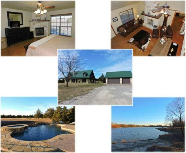 Tucked away on 15 beautiful lake front acres conveniently located to State Highway 121, this custom four bedroom, three bath home features a large gourmet island kitchen with granite counter-tops, double ovens, five burner gas cook top and more. The kitchen and dining area features a rustic pine ceiling with recessed lighting. The downstairs also includes a very generous master suite with cozy gas log fireplace, walk-in shower and jetted tub, a second bedroom and full bath and a generous gathering area with wood burning fireplace. Upstairs there are two large bedrooms, a full bath and a loft living area. Outside you'll enjoy fishing and boating on the large conservation lake as well as swimming in the custom salt water pool with hot tub and waterfall. There is an over-sized insulated 3 car garage with 8 doors and one drive-through stall for boat or trailer. There is a custom loafing shed barn with coral for horses or cattle.