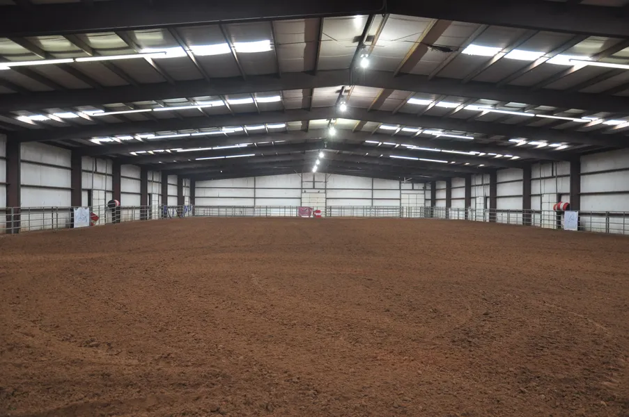 The focal point to this facility is the 104 X 275 indoor arena. The arena is located on the south central side of the property. The arena is fully insulated with fencing inside the building, announcers stand, bleachers, 2 bathrooms, roping boxes, Priefert roping chute and stripping chute. There is a covered double return alley that runs on the outside of the arena and covered cattle pens. The arena has 13 garage doors that can be opened in the summer time to allow plenty of airflow through the arena.