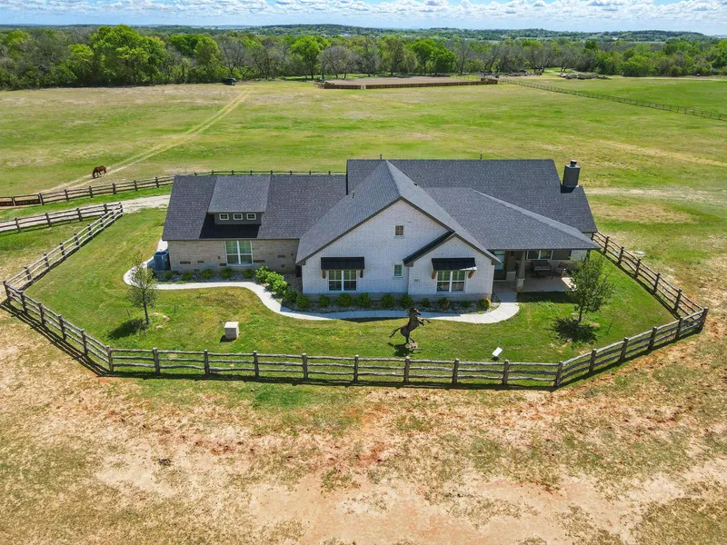 Stunning home situated on 15.4 acres in Brock Texas, this stunning 2,561 square foot custom-built home is nestled within the renowned Brock ISD. Only three years old, this home features a very open floor plan with large windows that overlook the lush coastal field, and it backs up to the serene Patrick Creek. With three bedrooms and two and a half baths, this open floor plan boasts beautiful hardwood throughout. Kitchen is open to the vaulted living room, lots of cabinets, large island, and high end appliances. The property is fully fenced and cross-fenced, with pipe rail fencing on the exterior and beautiful cedar fencing around the house. Enjoy outdoor living with a swimming pool and hot tube. Large shop featuring two glass roll-up doors, covered trailer storage, and four large stalls for horses. Stalls have auto waterers and premier stall feeders. New roping arena. Dont miss this opportunity to own your own horse property in Brock, Texas.
