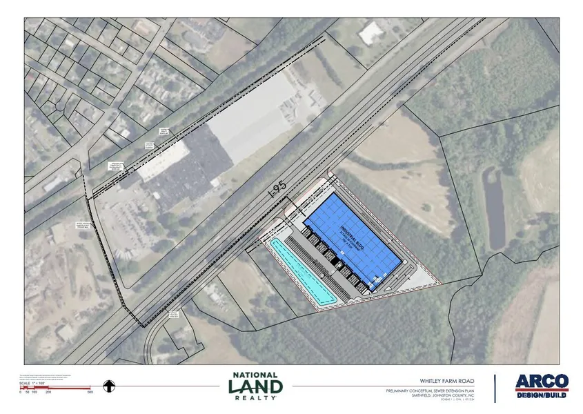 The property at 705 Whitley Farms Road, Smithfield NC is approximately 15.6 acres. It features 400 feet of road frontage on Whitley Farms Road. This location provides convenient access to I-95. The property offers a unique commercial development opportunity in the rapidly growing Johnston County market.