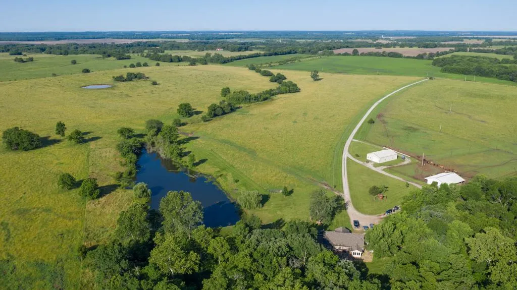 This incredibly maintained property is one of a kind. Driving down the fenced driveway, you feel at home immediately. The long driveway between pastures leads you to the beautiful 4 bed 3 bath home. A beautiful setting with picturesque stocked pond next to the house, and a flowing waterfall off the back patio. The home features an extra large 3 car attached garage, complete with 2 storage areas above the garage, new roof and gutters. Colored concrete and tile floors are easy to maintain and the kitchen has all new stainless steel appliances. 2 large family rooms each have gas fireplaces and large windows, perfect for entertaining. The property is currently being used as a cattle operation but would make an excellent horse ranch as well. Featuring a new insulated 40’x60’ shop with concrete floor, 40’x60’ barn with hay loft, tack room, and office with stall waterers and rubber mats in place. There are two corral systems, one by the barn and the other towards the southeast corner of the pasture, making it easy to work livestock in multiple locations. No shortage of water on this farm. There are multiple freeze proof waterers and hydrants in key locations and 4 ponds. Much of the farm has a gentle roll with good soils, which could be converted to tillable production for extra income. For the horse lovers, there is also a riding arena by the barn, complete with lights for your early morning or late night rides. The secluded residence is perfect for families and a quiet place to unwind. This well cared for farm is a must see. Contact Paul Lowry to schedule your private tour today at 816.500.2513.