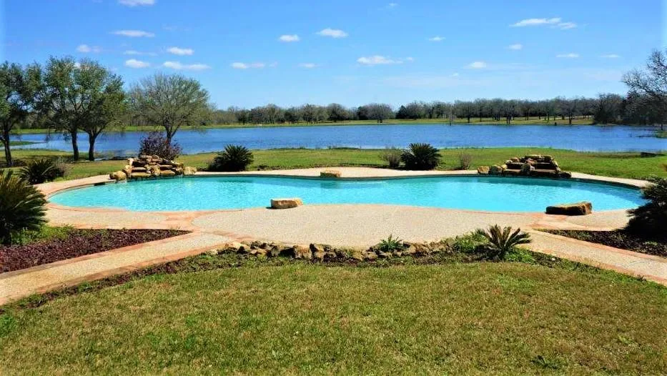 Lakefront in-ground pool with hot-tub and waterfalls! Pool House includes Mens and Womens separate bathrooms/dressing rooms on either side, and island bar with sink and granite countertops, new appliances, two gas grills with stainless vent-a-hoods, a range with two burners, and a pool storage room. There's a soccer/sports field with retaining walls next to the pool house.
