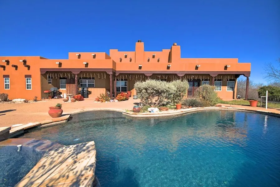 Beautiful Sante Fe style home secluded on 150 acres of pure Texas paradise. Hunt all you want in your own backyard. 4,800 sq.ft. home with intricate details reflecting Sante Fe with authentic Vigas, Kiva fireplaces and vaulted ceilings. Separate living space, huge game room with a wet-bar to entertain all your guests. Large front and back patio with a pool and extensive outdoor living space. Leave the city behind as you drive through the county to your front door. Watch the wildlife graze across your property with 360 degree views. Additional 22 acres available.