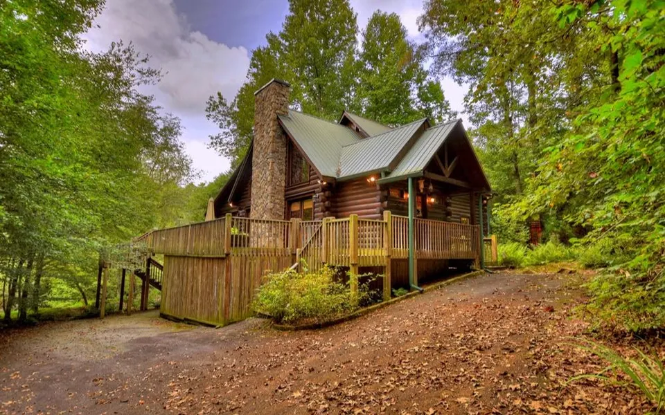 CARTECAY RIVER FRONTAGE in a nice community. 4/3.5 true D-log cabin on a gorgeous river front setting. Master & laundry on main and half bath for guests. Large great room with Cathedral ceiling, exposed beams, and rock gas log fireplace. Great room connects to screened porch that runs the full width of home with its own gas log fireplace ... the perfect place to relax and enjoy the sounds of the flowing river just feet from the home. Spacious kitchen with eating area and large pantry. Terrace level has large bedroom, full bath, and it's own concrete deck - the perfect place to host your outdoor river parties. Beautifully landscaped wooded lot with a professional horseshoe pit and large fire pit for many hours of enjoyment by the river. Deck at river's edge with steps to the water. Plenty of parking. Bonus lockable small garage underneath to park your ATV or golf cart.