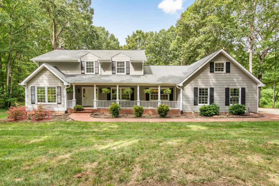 Traditional home nestled on 1.54 serene acres with lake front access. The covered front porch sets the character for the overall charm you will find throughout the home. Featuring hardwoods throughout main living area with spacious great room featuring a vaulted ceiling, gas log fireplace, and 2 sets of French doors accessing the large deck, plus 3rd door that accesses the backyard. Wood-burning fireplace adorns the den with built-in shelving. Gourmet kitchen would satisfy every chefs desire with double ovens (one is convection), Wilsonart solid surface countertops with integrated sink and glazed tile backsplash from Italy. This home is created with the thoughts of entertaining family and friends. Recreation room and exercise room in the basement along with a walk-out door to the patio. 2-Car attached garage. The lot offers privacy and a great place to unwind.