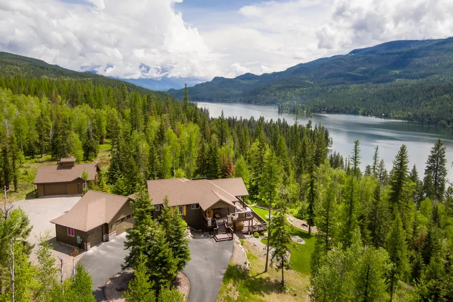 Swan Lake Views! This custom designed 4,000+ sf, 4 bedroom 3 bath home has an attached 3 car garage, plus detached 1,000 sf 2-car garage with heated workshop & dog shower. Situated at the end of a paved cul de sac, on 6 1/2 wooded acres bordering Montana State land with breathtaking views of Swan Lake and Crane Mountains. This property has the beauty and serenity you've been looking for. The great room combines the family room, kitchen and dining room. There are hardwood floors throughout, a gas fireplace with stone facing and a custom mantel. The chef's kitchen has professional appliances, custom knotty alder cabinetry, and an oversized granite island with extra deep sink and storage. The spacious dining area includes a large picture window with views of water & Mtns. Main floor master