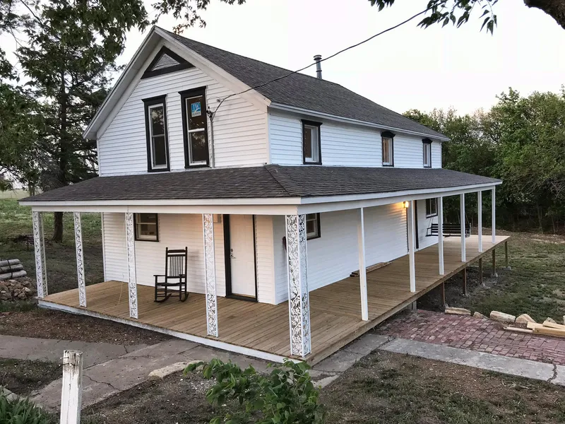 This classic country home features a wrap-around covered porch ideal for enjoying the peaceful prairie surroundings. An old spinning windmill head towers over the private well.