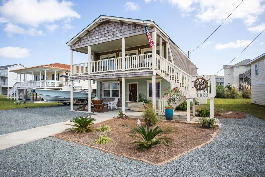 Here's the beach cottage you've been waiting for! Sitting on Carolina Blvd on the sound side of Topsail Beach, this home has weathered the storms since it was first built in 1956! The ground level is built on a 5 foot thick slab that was poured by the military during Operation Bumblebee, and the top level is about 1053 HSF and was added in 1975. As you enter the 1298 HSF lower level you'll notice the beautiful epoxy finished concrete floors and the open, airy, combined kitchen and dining area. The master bedroom is on the left and has a great water view out of the windows! Pass thru toward the middle and there's a second bedroom and full bath complete with a walk in tile shower. The stacked washer and dryer are in a larger closet, and two beds have been added in this room. The living room is in the back of the house, where the back door leads you to the fenced back yard. The top level has an amazing covered deck with a stunning sunset and water views while you enjoy your favorite beverage. Upstairs you'll find beautiful hardwood floors, an open living area, efficient kitchen, large master bedroom, spacious bath with walk in shower, a dining area, & built ins to display your favorite beach treasures. The back deck is perfect for soaking up rays, and you can even hear the waves of the ocean while you sunbathe! There's an outdoor shower to rinse off the sand and salt from all the fun you'll have experiencing the coastal NC lifestyle! This place may be a perfect rental investment property with its two levels, or you could even live in one level and rent out the other for supplemental income. This home has the beach cottage charm we all love, with the modern updates you'd expect already done. Since the sellers bought it, they've replaced the roof, water heater, appliances, cabinets, and more. Thoughtful attention to detail while improving the home is evident when you see it.