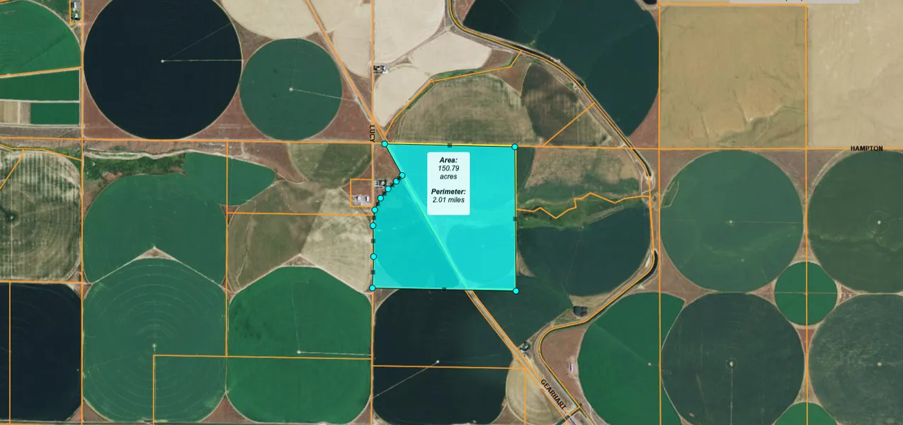 Approximately 151 gross acres with 136 acres under pivot. There are two half circles and one full circle. The house is not included and will be short platted out with approximately seven acres.