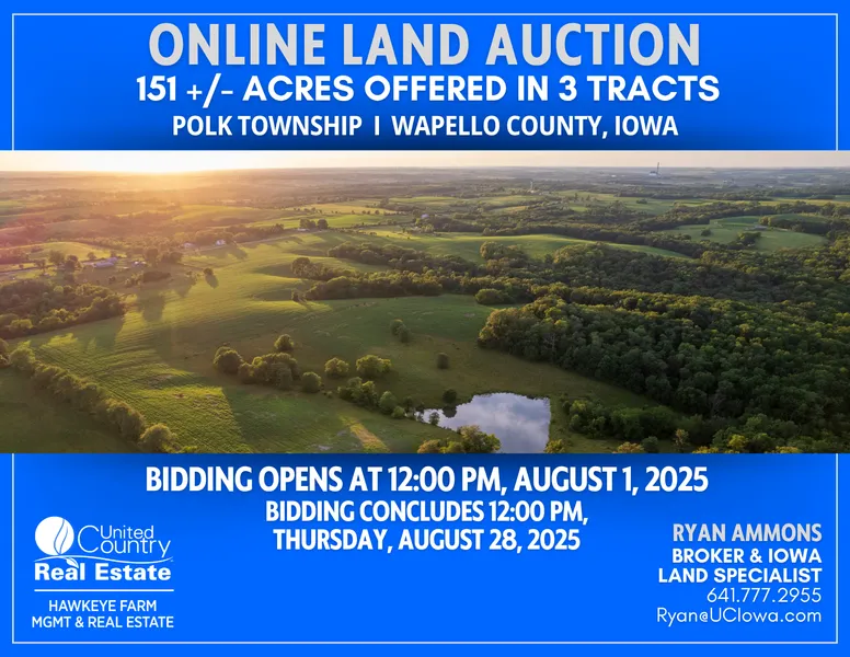 Sale Date: Online Only Auction. Bidding will open for active participation on August 11, 2025, at 12:00 PM, with the auction closing one week later on Thursday August 28, 2025, at 12:00 PM through United Country Hawkeye Farm Mgmt & Real Estates Bidwrangler auction platform. UCIowa . Bidwranger . Com