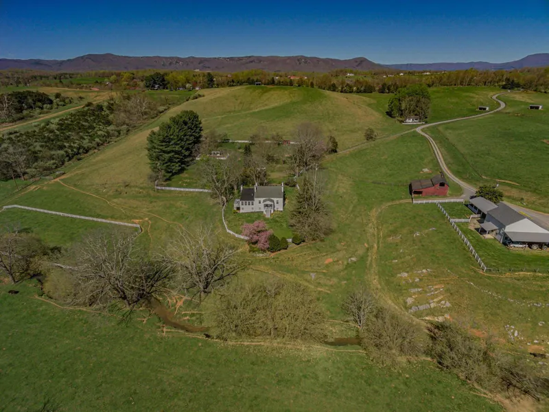 Five Chimneys Farm, c.1820, offers over 187 acres of rolling farmland in a protected setting situated along year-round Poague Run with easy highway access and minutes from downtown Lexington. Historic brick main residence features classic period features such as fireplaces, ornate crown moldings and wainscoting, four bedrooms, and two and a half baths. Privately situated guest or rental cottage features kitchen, living room, two bedrooms, and one full bath. Substantial equestrian infrastructure in place such as large riding ring, numerous run-in sheds, fencing, and barn complete with four stalls, tack room, and wash rack. Massive three bay shop building with water and electric allows for equipment storage. Additional storage available in separate barn and outbuildings.