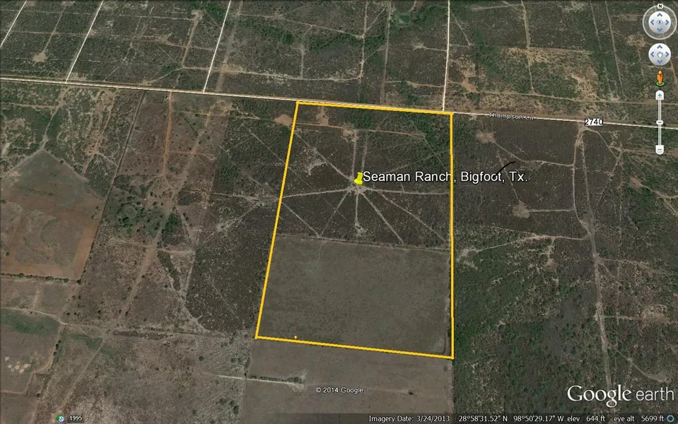 This is a great recreational ranch located 1 hour from San Antonio, just outside of Devine/Bigfoot, Tx. off paved road FM 472 on gravel road CR 2740/Thompson Road in Frio County. The property has frontage on CR 2740 and is rectangular in shape. It has a 50+/- acre field covered in grass and the balance of the ranch is your typical South Texas brush country, prickly pear, bull and small mesquite's, guajillo, black brush, cat claw acacia, desert yaupon, etc. Wildlife on the ranch include white tailed deer, hogs, bobcat, quail, turkey, dove, etc. The ranch has some elevation, along with some small draws running thought the property. Native grasses are abundant and numerous senderos cross thought the property for hunting and driving. The ranch is low fenced with most of the fencing in good condition. There is one small tank (currently dry) on the property and NO water well has been drilled to date (Carrizo/ Wilcox water is approximately 300 to 375 ft. in depth). There is electricity on the property which provides power to some of the small producing oil wells on the ranch today (NO minerals are available).