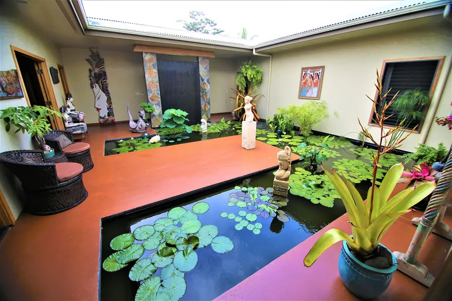Situated on a beautifully landscaped acre, this island sanctuary is built around a 700 square foot central atrium, open to the sky, with a large koi pond with an 8' two-sided fountain. This designer home will serenade you with tranquil water sounds, birdsong, and island breezes.