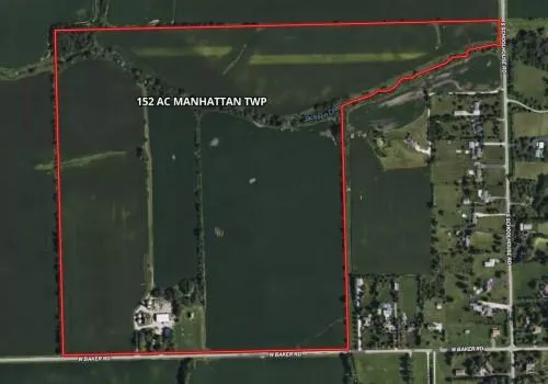 152 acres of farmland now available on W Baker Road in Manhattan, IL. Productive farmland with possible development potential. Full set of farm buildings. Value in the land. Good quality farmland with a PI of 125.5 . The farm does have flood plain acres.