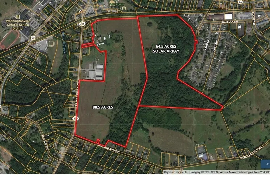 Largest vacant land parcel left in the Village of Washingtonville with WATER AND SEWER. There are two contiguous parcels. 121-1-1.1 is 88.5 acres and the contiguous parcel of 64.5 acres is SBL 119-1-1.1. There was a full engineered plan done in the late 2000's for an age restricted high density housing development. Solar lease in place on the 64.5 acre property, which brings in $30,000 yearly and has yearly bumps in rent for 30 years. There are two concept plans, one showing multi family and the other commercial. Village is presently in a moratorium. All information is in documents. Seller is keeping the old farmhouse and one outbuilding on new SBL 118-1-4, which is 3.43 acres.