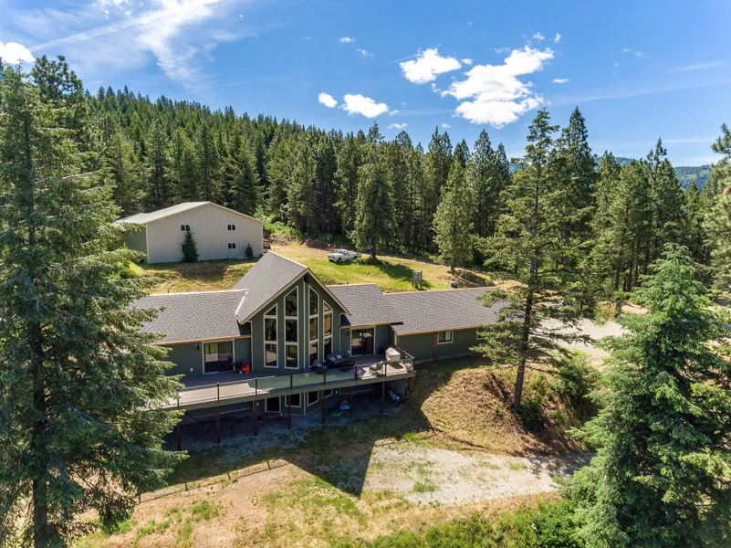Custom home with large master suite on first floor. Travertine tile floors and radiant heat. Great views over Newman Lake, Spokane River all the way to Mount Spokane. *Great opportunity to finish walkout daylight basement. (3 more BR & 1 Bath). All frames, prewired & plumbed. Very large pole building 4300 Sq Ft plus 6 car attached garage! Wired for hot tub on deck.