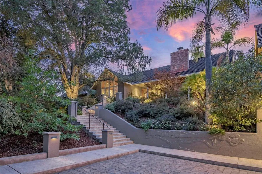 Beautifully remodeled by Mehus Construction, this "Spiere Peaked" home is spaciously laid out on one level w/a large sunken living room overlooking the beautiful outdoors. Sunlight fills the home thru large windows & custom skylights, while raised open beam ceilings add to the grandeur of this home. The centrally located gourmet kitchen is the hub for all activity, from your day-to-day family meals or entertaining with loved ones; prep island, 6-burner gas stove, separate griddle & wet bar countertop too. The executive master suite features soaring ceilings w/ peaked windows, "his & hers" designer closets & bathroom vanities. The 5th bedroom is ideal for "in-laws" quarters or guest room/suite. Approximate 450sf pool-cabana room (not included in house square footage) in b/y features a lounge/gaming area, wet bar with fridge & dishwasher & full bathroom too. This magical, serene setting has been lovingly maintained and is ready for you to create your own special Oasis in Saratoga.