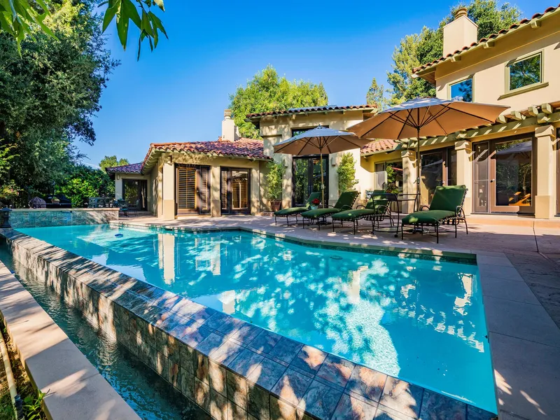 Welcome to privacy and serenity situated on 1.59 acres of natural beauty. This one-story Mediterranean estate captures the essence of Bell Canyon. The enclosed courtyard invites you to the infinity pool & clear glass double doors. The two-story entry is inviting with slate flooring. The living room features a wood-beamed ceiling & rock fireplace. The office/study is situated with a bath and double French doors which lead to the private hall & bedrooms. The large bedrooms are next to the master suite. The spacious master retreat features a gym, walk-in closets, beautiful bath, fireplace, wood-beamed ceilings, bar & direct access to the pool/spa. The dining room is close to the kitchenconvenient for entertaining. The gourmet kitchen has a stainless-steel commercial stove with grill and griddle, double ovens, two sinks, bar, built-in wine refrigerator, glass cabinets & a rock fireplace. Off the kitchen is the laundry area & separate quarters with a private bath. The family room has two-story ceilings, rock fireplace & French doors overlooking the patio. Upstairs is a bonus or game room with attractive built-ins & a separate space which can be used for a computer area. Off the game room is a balcony overlooking the property while taking in the scenic views of Bell Canyon Creek. Outside, enjoy a recently redone pool & spa, side patio for a barbecue, long fenced-in dog run, & private bridge which takes you to Bell Canyon Creek. Over the bridge is an exclusive park-like setting.