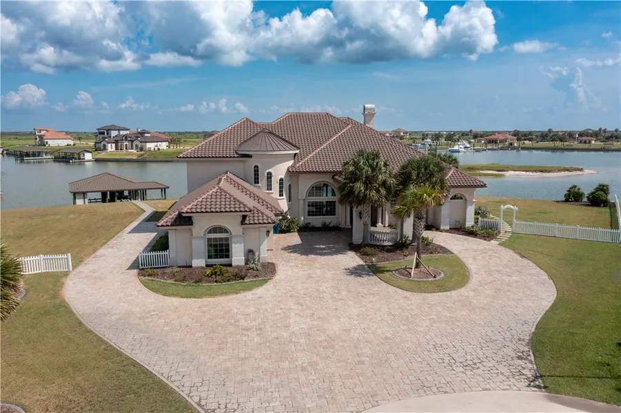 Located in The Sanctuary just outside of Port O'Connor, this expansive 6,053 sqft waterfront home offers a perfect blend of luxury, comfort and natural beauty. Set across two spacious lots and equipped with a covered boat lift for two boats, this property embodies the essence of refined coastal living. Upon entering you will be greeted by the elegant, formal living area with a custom fireplace, a wet bar and floor-to-ceiling windows overlooking the meticulously manicured landscape and infinity pool. The Primary Suite is a peaceful haven, featuring panoramic water views, a large walk-in closet and a spa-like ensuite bathroom where you can unwind in the elegant tub or the oversized rain shower. Up the grand stairway to the ultimate entertaining areas you will find a state-of-the-art Theatre room, Game room and upstairs bar area that leads to the private balcony overseeing the backyard.