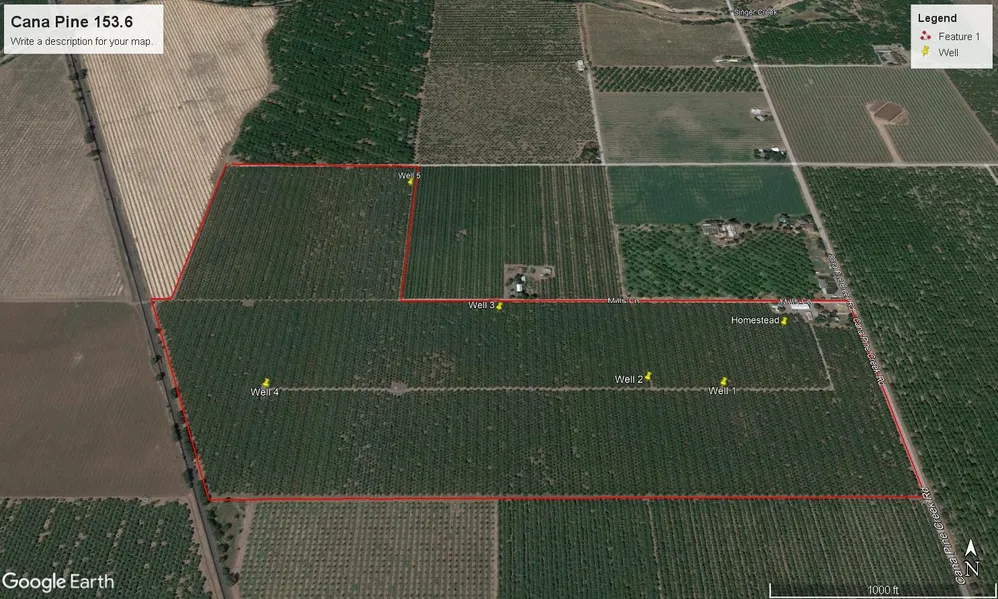 153.6 acres with 140 acres M/L planted to almonds in 1992. Varieties consist of 1/3 Price, 1/3 Peerless, 1/3 Carmel. Spacing is 18 X 18. Irrigation is from 5 wells producing 5,450 GPM M/L via micro sprinkler irrigation. There is an older 3/2 2,106 Sf home which is rented. There are numerous outbuildings with a metal 4,375 Sf shop with concrete floors and electric. This is a very well-maintained orchard with good production history. 2023 production 1,900 lbs. See production and appraisal attached.