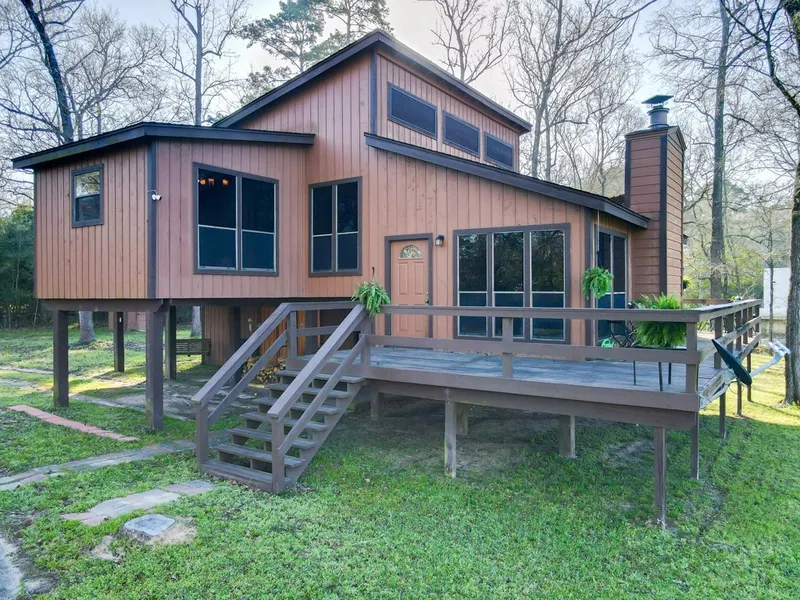 **Unique and Serene Retreat in Magnolia, TX** Discover the perfect blend of tranquility and convenience in this one-of-a-kind 3-bedroom, 2-bath home nestled in the heart of Magnolia. With a generous layout, this property boasts a remarkable design featuring towering pine and majestic oak trees, creating a scenic backdrop that complements its charm. Just moments away from Conroe and the bustling Woodlands Mall, you're perfectly positioned for easy access to nearby amenities. Step inside to experience the inviting warmth of the expansive 3-story interior, enhanced by an exquisite rock wood-burning fireplace, a centerpiece perfect for cozy evenings. Abundant windows flood the space with natural light, creating an airy ambiance ideal for relaxation. The exterior wraps around a striking porch elevated on stilts, offering picturesque views and a seamless connection to nature. Impressive outdoor features include a sprawling deck designed for gatherings and soaking in the serene surroundings. The property also offers a versatile 2-car garage, complete with a large office space, perfect for remote work or creative endeavors. A metal storage building with electric hookups, a 10x10 storage room attached to the home, and an insulated well house provide ample space for all your needs.