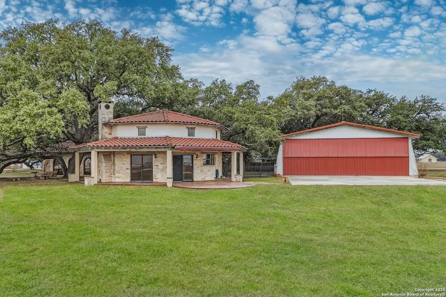 Preferred lender is offering a 1% lender concession for the buyer to use towards closing costs and/or interest rate buydown. At the edge of San Geronimo Air Park sits an incredible find - an octagonal residence that marries form and function for the aviation enthusiast. The stone exterior and red tile roof create an immediate sense of historic charm, while multiple sliding glass doors forge a seamless connection between indoor living spaces and the spacious outdoors. A courtyard anchored by a majestic oak tree and thoughtfully laid pavers provides an enchanting outdoor sanctuary. The interior's most striking feature is its abundant natural light, enhanced by the home's unique eight-sided design. The kitchen features a central island that doesn't just serve as a workspace but creates a natural gathering point. The living room showcases a stone fireplace with custom carved details by a renowned artisan, adding both warmth and artistic gravitas to the space. The primary suite offers generous proportions, complemented by a bathroom featuring a corner soaking tub. A dedicated utility room comes equipped with built-in storage solutions. The enclosed carport, finished with laminate flooring and climate-controlled via a ductless system, provides flexible additional space. Aviation enthusiasts will appreciate the two-story hangar, which includes a fully-appointed efficiency apartment complete with modern stackable front-loading laundry and dryer. The apartment could easily be used as a potential income producing property. The property's gated access ensures privacy, while mature trees throughout the grounds create a serene backdrop for this distinctive residence that seamlessly blends daily living with aviation accessibility.