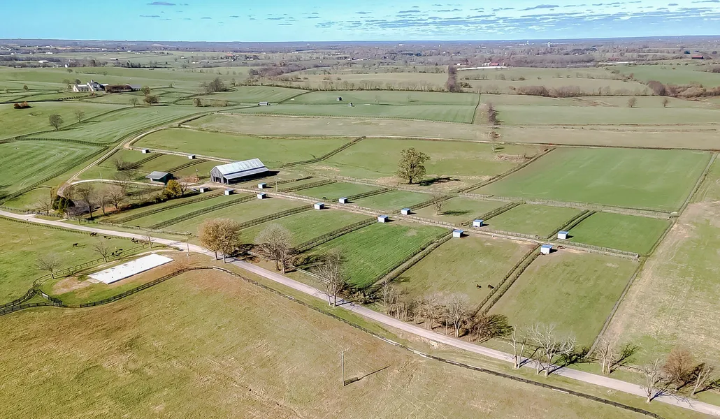 This +/- 155 acres standardbred horse farm in Bourbon County is a proposed subdivision of a main tract located at 351 Spears Mill Rd in Paris, Kentucky, with a 5/8 mile oval standardbred track, and approximately 1,200 feet of road frontage. The property includes a 3-bedroom, 1-bath house sold "as-is" for renovation, a converted 18-stall tobacco barn (120 x 60 feet) with stalls measuring 11 x 13 feet, a wash stall, and a storage room. An attached open-side shed provides additional equipment and storage space. The farm also features 18 paddocks (ranging from +/- 1/2 acre to acre), with 16 turn out paddocks with small run-in sheds and automatic waterers, as well as 3 pastures (+/- 5 acres, 6 acres, and 6.6 acres). A 30' x 40' metal workshop with roll-down doors is also included. The entire property is fully fenced with either four-plank or V-mesh wire. Located near the corner of Winchester Rd and Spears Mill Rd, this farm is in close proximity to Claiborne Farm, Stone Farm, Siena Farm, Stoneriggs Farm, and Hidden Brook Farm. It is just 8 minutes from Paris and 35 minutes from Lexington, making it a prime location for equine use. The property is ready for horses to move in.
