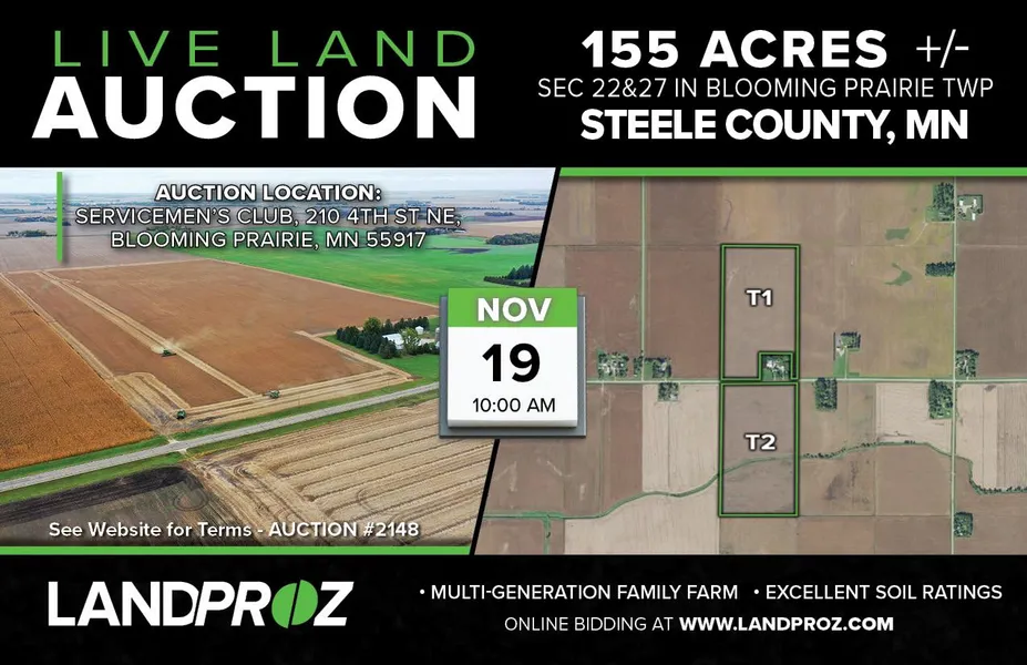 A very rare chance to own a multi-generational family farm. 2 nearly perfect parcels located just west of Blooming Prairie on State Highway 30; approximately 2 miles. The farm will be offered to the public at auction on Friday, November 19, 2021 at 10:00 AM at the Blooming Prairie Servicemens Club.