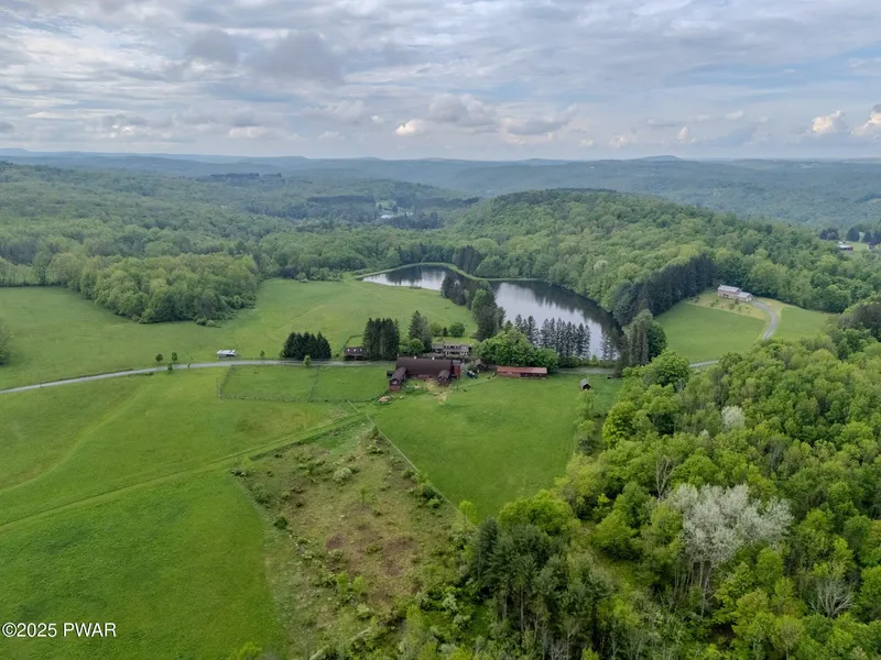 155-ACRE LEGACY FARM ESTATE in Northern Wayne County! Rare opportunity to own an extraordinary, one-of-a-kind 155-acre farm in bucolic Dyberry Township, just five miles from downtown Honesdale. In the same family for over 5 decades, this exceptional property features rolling hills, meadows, woods, fenced pastures, and two beautiful bodies of water--an 8-acre lake that provides a picturesque backdrop to the main home, and a peaceful 1 acre pond tucked further into the fields. At the heart of the spacious 4BR/3BA main residence is the sprawling gourmet kitchen perfect for gathering and offering sweeping lake views. The bright and welcoming living room features hardwood floors, custom built-ins, a cozy library area, and is highlighted by a stone-faced wood-burning fireplace. Unique touches include an attached greenhouse accessible from the potting room, and a wine cellar for convenient, climate-controlled storage. A second home--ideal for a caretaker, rental, or multi-generational living--includes 2BR/1BA and a sprawling upper-level studio. Across the quiet country road, a substantial barn, equipped for horses, w/ 13 horse stalls, water, electric, & hay/storage area is complemented by numerous attached & detached outbuildings: a poultry coop, sheep shed, run-in shed, silo, office space, former milk house, and a vintage oversized bird cage. The property also includes a 2-car garage, a 5-bay equipment/storage building, and a multi-level tool & tack shed. Behind the homes, you'll find an orchard with fruit trees, blueberry bushes, and a fenced garden area. Once a thriving Black Angus operation, and Dairy before that, this farm is perfectly suited for continued agricultural use, equestrian pursuits, or outdoor recreation. With excellent hunting, fishing, and miles of private trails, this is a legacy property offering a complete and well-rounded country lifestyle. Please note that there are surveillance cameras in place throughout the property for security purposes.