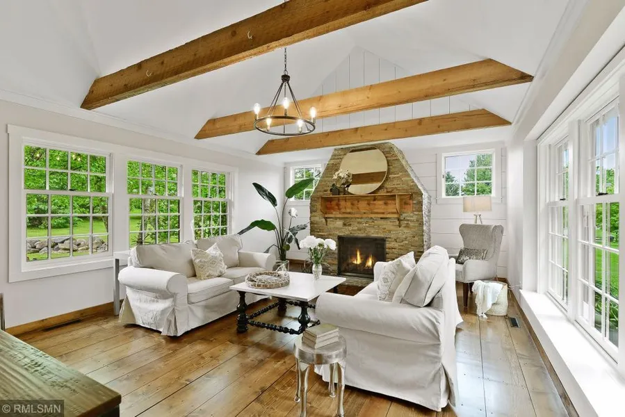 Absolutely Charming! Private country feel with easy city access! 2.4 Acres, close to everything but quiet and serene. The fresh and fabulous custom interior is surrounded by gardens, green space and blue skies. A Chef's kitchen, vaulted beamed ceilings, shiplap, huge windows, cozy nooks, and a screened porch complete the New Farmhouse ambiance. Beautiful wide plank hardwood, tile and cork floors - custom woodwork and cabinetry with quality finishes create character throughout. 4 fireplaces and professionally designed interior! A special bonus is the unique Studio - a short walk across the garden! Exceptionally versatile - it works as a large gathering entertaining space, a guest house or home based business with private entrance and parking! This park like setting includes a picket fenced garden and huge flat yard complete with large shade trees. High demand Lakeville Schools, Murphy Hanrehan Regional Park and easy access to everything complete your private sanctuary. Charming!