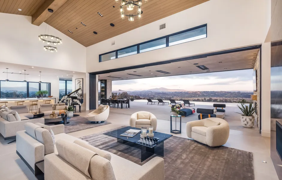 Unobstructed, private, forever jetliner views. Designed by renowned architect John Jensen & completed in 2024 with absolutely no expense spared, this brand new custom construction estate situated in the west side of the Rancho Santa Fe Covenant, offers extraordinary 180 degree top of the hill views & beautiful finishes throughout. Privately gated & located on one of the best streets in Rancho Santa Fe based on its accessibility to the area's best restaurants, shops, schools & attractions, this exquisite masterpiece offers 10,200 square feet of useable space under roof - of which approximately 8,000 square feet of livable square footage - on a spacious 3.32 acre lot. Upon entry, you are immediately mesmerized by the giant glass pivot entry door & the 35 feet tall sliding glass doors that open to the stunning 62 foot infinity edge pool with separate jacuzzi overlooking the panoramic views. The home features beautiful porcelain floors imported from Spain inside & out for a seamless transition, custom kitchen with a 11 foot x 6 foot marble waterfall island & a 20 foot 4 way book matched granite wall feature in the great room. Inside you will find 2 custom bars, custom designed theater by CHT, gym, wine room with natural stone, under-lit floating staircase, & an extensive use of large glass doors & windows (La Cantina, Wyland) to maximize the view. The exterior grounds of the home feature: a permeable paver driveway for the storm drain + 2 tanks for water retention, parking for 20 cars in the driveway + garaged parking for 4-5 vehicles in the subterranean garage, 50 year old mature olive trees & extensive landscape lighting. There is also a pre-designated space prepared & ready for an elevator. The home was built with the finest attention to detail & the best materials & design. Do not miss this once-in-a-lifetime opportunity.