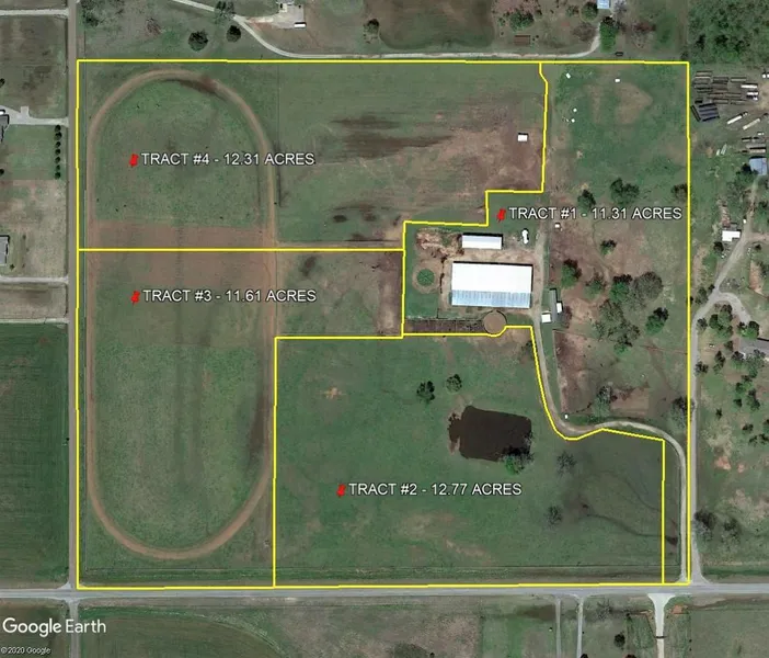 REAL PROPERTY: This is a very unique property. It's a Horseman/Trainer's dream, has great home sites for Individuals desiring a ranchette or the Investor for a future development. The 48 acres will be offered For Sale at Auction divided in 4 separate Tracts. The property features a 25 Stall Barn, 6 of those stalls are Stud Stalls with Tack Room, Wash Rack, Breeding Stocks and 20 additional pipe runs under shelter. There's a double wide mobile home, round pen and equipment shed in close proximity to the barn and also a half mile training track. It's in a prime location with a quarter mile of road frontage on SE 12th Avenue and a third or a mile frontage on Hwy 74 (E. Maple Road). The entire perimeter is fenced and cross-fenced with a stock pond on Tract #2. Ready for your horses, cattle, exotics or development. Enjoy the peace and quiet of living in the country with all the creature comforts just minutes away. Easy access to I-35 and less than 45 minutes to Downtown Oklahoma City, Will Rogers World Airport, Oklahoma State Fair Park and horse racing a Remington Park.