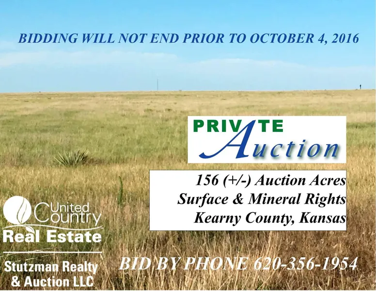 Contact United Country Stutzman Realty and Auction in Ulysses, KS to inquire about this Private Auction. Bid By Phone. Bid by October 4, 2016. This 156 +/- acre tract of land with mineral rights is located along the Kearny / Hamilton County Line, 1 mile north of HWY 50. SW/4 of 18-24-38 in Kearny County, KS. 96.7 Acres of CRP with an annual payment 0f $3,092.00 thru 09/30/2022. 59.3 +/- Acres of Native Grass. Producing Mineral Rights shall be included. Call the Office at (620)356-1954 or Jerry Stutzman at (620)353-9411 or Tobias Stutzman at (620)952-1478 for more information or to inquire where the bid is at.