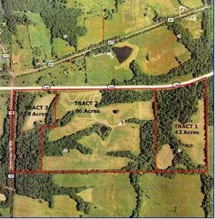 Tract 1 lies on the east side of the property and has 42 acres, its own driveway off of Hwy 154 is already in place. This tract has heavy timber all along the front for privacy and along the west side and south end. The middle and east side are open and currently being used for crop production. There is an oval piece in the southeast corner that is being farmed.