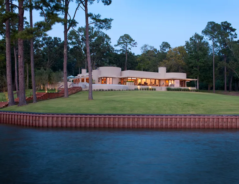 The house kneels quietly by the water, a stucco and stone structure marked by generous expanses of glass walls that provide breathtaking views of the outdoors. Inspired by Frank Lloyd Wrights unrealized plans for his Ralph Jester House, the homes circular architecture is like nothing before seen in the area: a serene wooded lakefront enclave just 20 minutes from downtown Tyler. This quote from Luxe Magazine describes perfectly this spectacular home situated on almost 10 acres with 1000 feet of shoreline, the location establishes itself as one of the most valuable and pristine lots on Lake Tyler. The intentionality of the design starts with the gated entrance showcasing the circular metal work on the gate. Upon entering the water view greets you inviting you to breathe in peace. The main living room and dining room are encased in glass and open to the kitchen. The kitchen is built in a circular shape with custom cabinetry by Reznikoff, Sub Zero freezer and refrigerator,appliances by DCS, and stone countertops. The home utilizes a smart home system to control the lighting, sound, security system and electric window shades. The home theater has a state-of-the art projection system and a wall of Nano doors creating an indoor/outdoor room open to the outdoor kitchen. The master suite invites the outdoors in with views to the lake beyond. There is also a guest room with bathroom and office. The hallway with built in bookshelves is a favorite of the current owners! The guest home has a kitchenette, 2 bedrooms, 1 full bath and living room also encased in glass. The 2nd guest home has 2 bedrooms, 2 bathrooms, a full kitchen, dining/living room with an outdoor deck . The outdoor space provides