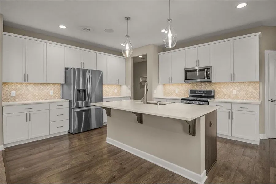 Move right in to this beautiful home. Kitchen w/ quartz island & countertops, tile backsplash, under cabinet lighting, soft close doors and drawers, SS appliances plus a big walk-in pantry. Open floor plan kitchen, informal dining room and family room. Four BRs plus a versatile loft and convenient laundry on UL. Front flex room makes a great sitting area or office. Second bonus space off kitchen another great space for an at-home office or study area. Buyers will enjoy the surround sound system in kitchen, FR and back patio. PRBR suite with gorgeous private BA and walk-in closet. PRBA has separate tub & shower plus comfort-height dual sink vanity and linen closet. New carpet and fresh paint throughout entire property-2025. Concrete patio to relax and enjoy the outdoors plus fenced backyard. Enjoy neighborhood pool and walking trails around beautiful Cobblestone Lake. Under a mile to multiple restaurants & shopping. 1yr HSA Home Warranty paid for by Sellers for new Buyers.
