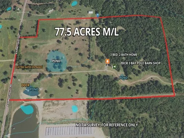 Water, water, everywhere! This 77 Acre property is just minutes from Lake Fort Gibson! It has 3 ponds!! First pond in newly dug and approx. 8 acres. 2nd pond is stocked and ready for fishing! 3rd pond has an epic dock perfect for fishing from!! This land is partially wooded and partially cleared for livestock! Located off a paved road with pipe fence entry and electronic gate. A 20x30, 3 bay pole barn shop, storm cellar & 3 bed, 2 bath home! A must-see!!