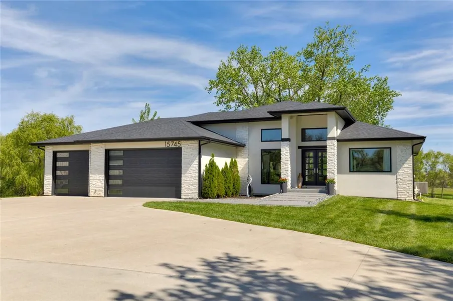 Welcome to this contemporary property on nearly 2 ac in Urbandale w/in Waukee schools. This modern, sophisticated home offers 5 BR, 4.5 BA, + 5,000+ SF of meticulously crafted living space. A concrete slab + pebble walkway blends natural elements. Main lvl boasts 14' ceilings w/ engineered hdwd. A custom wall w/ modern, linear fireplace serves as a perfect focal point. The chef?s kitchen incl sleek countertops, a 14? island, coffee bar, high-end SS appl, custom cabinetry, + pantry w/ icemaker + sink. Hidden outlets maintain a clean, modern aesthetic. The primary suite feat. a spa-like ensuite bath w/ soaking tub, dual-head walk-in shower + spacious walk-in closet. The main floor incl two add'l BR + second full bath. Finished w/o basement w/ 9? ceilings offers add'l living, a dedicated fitness area, wet bar, two add'l BR + two full baths. A 12? slider leads to a covered patio. Enjoy ultimate privacy w/ no neighbors behind. The 1.91-acre lot incl a putting green, pickleball/BB court, turf area, firepit + polished concrete covered patio w/ fully equipped outdoor kitchen. The travertine tile patio + walkway add elegance. The 1,100SF heated 4-car garage feat 10? doors, epoxy floors, a wash bay w/ hot/cold water, + an EV charger. Custom LED lighting + energy-eff systems, main floor laundry, landscaped yard w/ privacy + tranquility. Located in a private neighborhood with access to schools, parks, shopping, dining + a quick commute to downtown Des Moines.