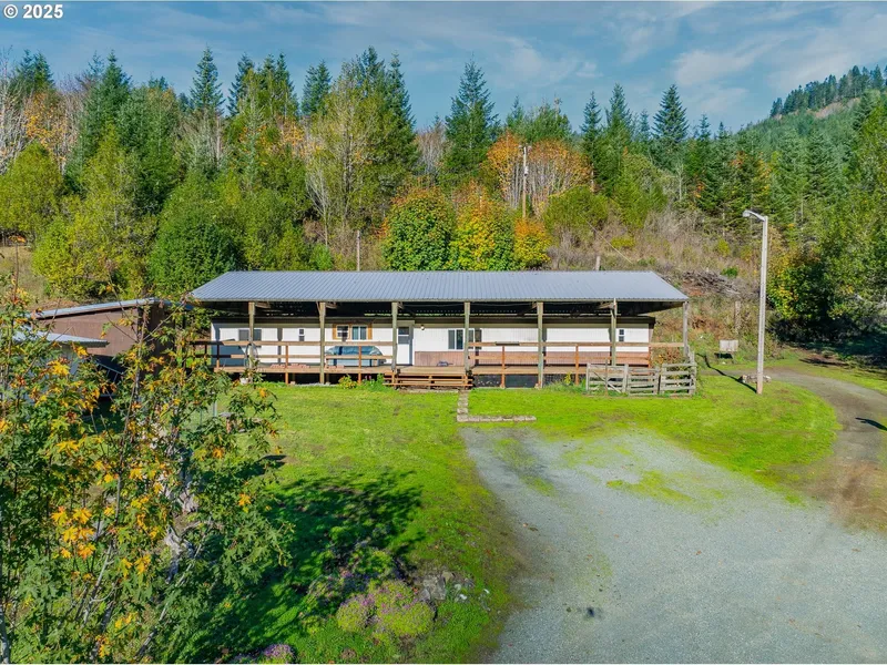 1.54 Acres within about 5 minutes of Myrtle Point, 1980 Homette single wide mobile home 14 X 66, with 924 sq. ft, 3 Bedrooms and 2 Bathrooms, kitchen has been updated nicely, Electric forced air heat, spacious add-on laundry room that is 12 X 12, there is a pole building structure over the mobile that allows for a carport area in the back and covered deck in the front. Plenty of room for parking vehicles and RV's. Old farmhouse is currently used for work shop and storage.