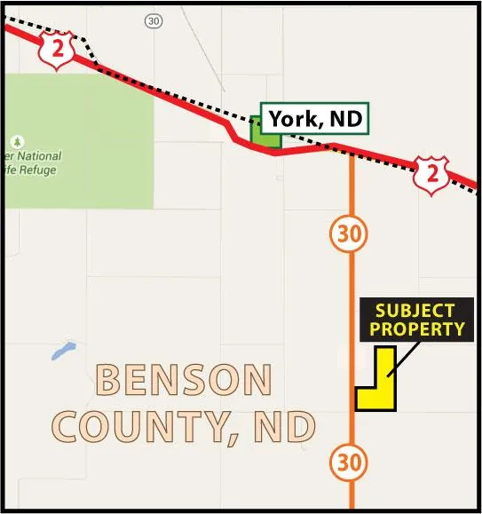 Driving Directions: From the Intersection of US Hwy 2 and County Road 30 east of York, ND, proceed south 4 miles on County Road 30. This will bring you to the southwest corner of the property.