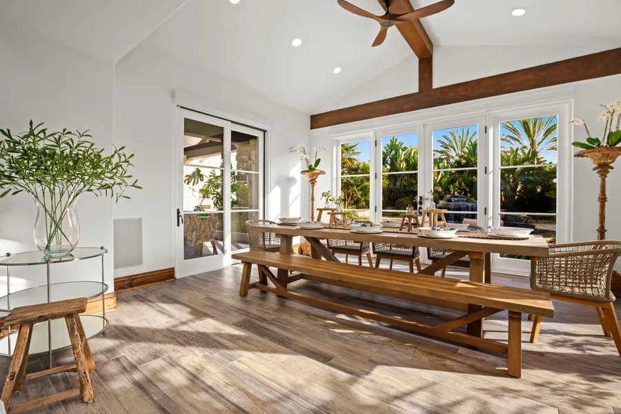 From the Grand Entrance of this Luxurious Single Story Estate to the idyllic 2 acre Resort-style Outdoor Lifestyle, this 5 bedroom, 4 bath custom designed and meticulously crafted manor is located in the premier and exclusive community of the River Estates in Rancho Santa Fe. Located on 2 acres, the luscious flora creates an inviting and very private environment with your own personal first-class style amenities including an extraordinary pool with waterfall, spa, outdoor kitchen/BBQ, pizza oven Enjoy the sport court, putting green, bocce ball, koi pond, expansive grass area and casitas. . The outdoor lighting creates the perfect tranquil setting whilst enjoying the evening sunsets. Detached casita perfect with kitchenette