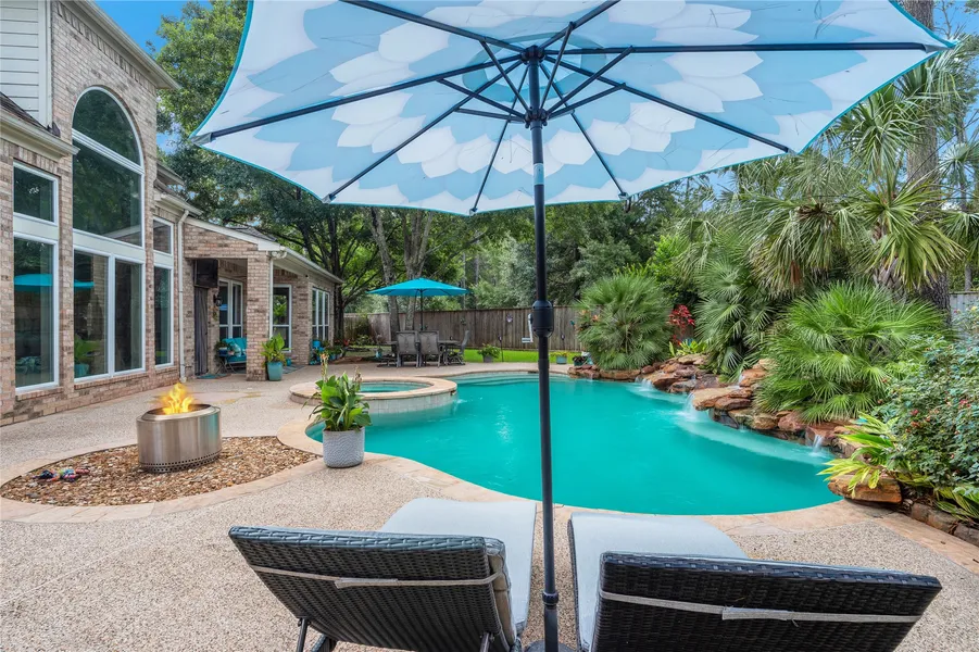 This spacious 4 bedroom, 3 & 1/2 bathroom house is situated in a gated community. The property features an almost half acre cul-de-sac treed lot, a tropical pool and spa, a game room, a media room, & a sunroom. The primary bedroom offers an en-suite bathroom with glass shower and large stand alone tub. The three additional bedrooms are nice sized all with walk in closets. Sandwiched between two bedrooms is a jack-n-jill bath ,each bedroom having their own separate vanity. The two story living room features a wall of windows & a two story marble chevron statement fireplace. The gourmet kitchen is equipped with Cambria Quartz counters, soft closing doors and drawers, under cabinet lighting, and pull out drawers. The sunroom provides a bright and airy environment, perfect for relaxation. The dual staircase adds a touch of elegance to the home's interior. This home has been updates head to toe including roof, windows, pool, lighting, 50 amp plug for generator & more! New carpet soon.